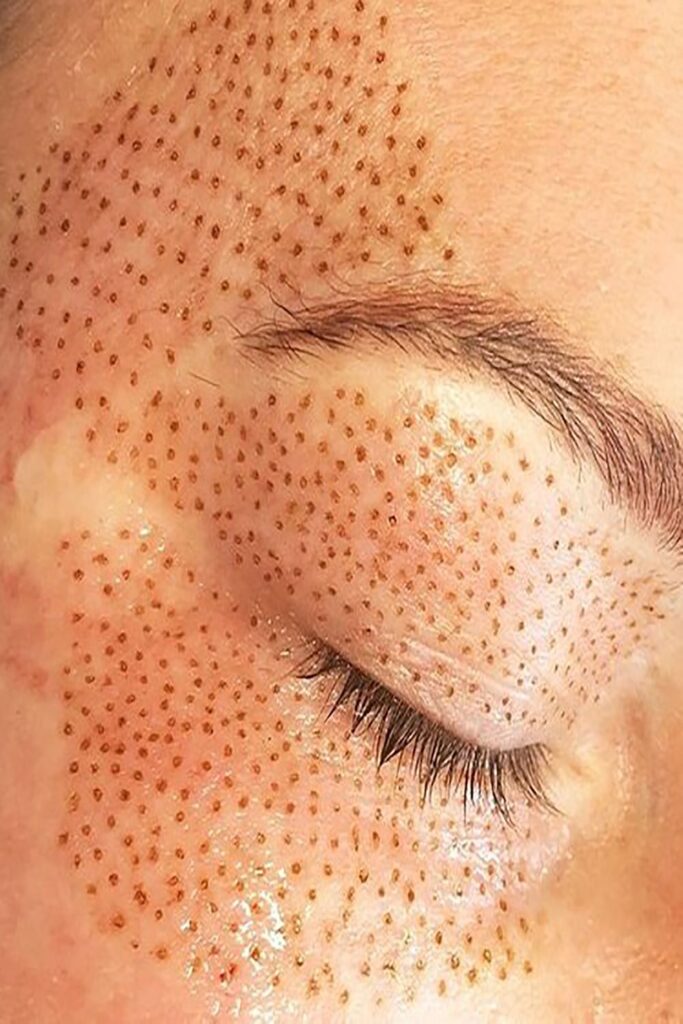 After treatment, small carbon crusts (tiny brown dots) form on the skin and fall off naturally within 5–10 days.